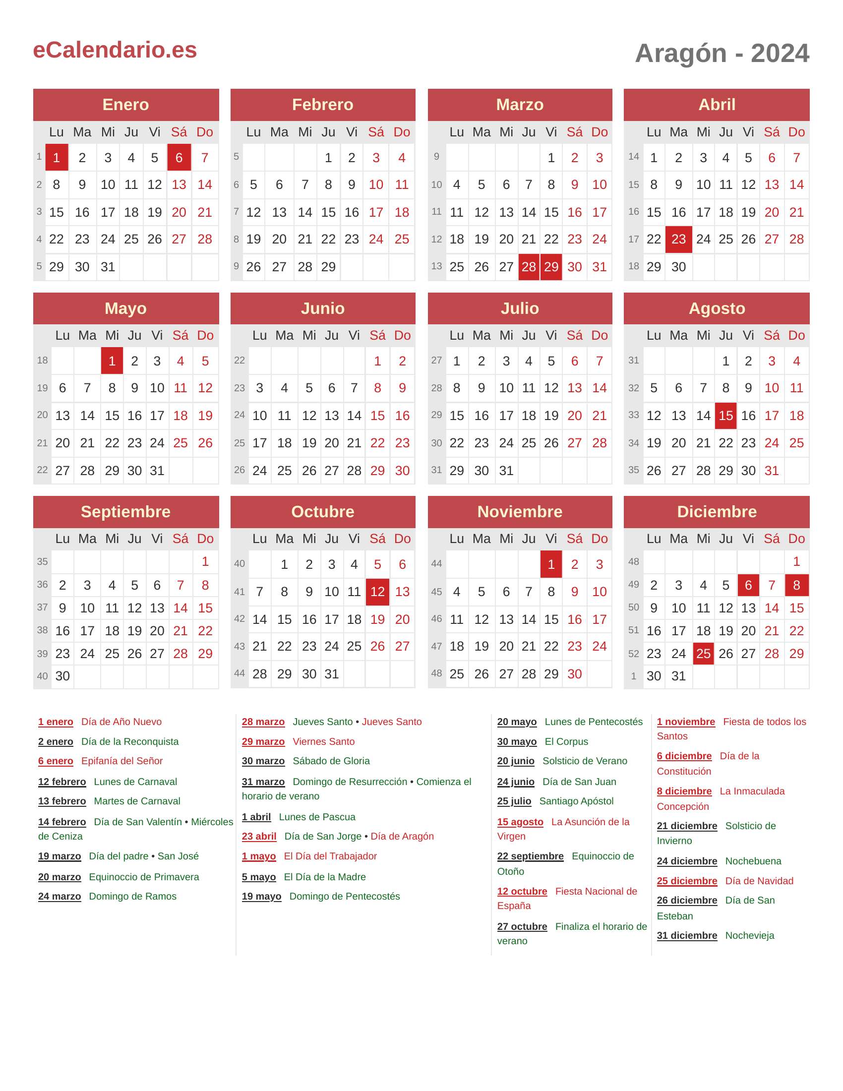 Calendario 2024 - Aragón