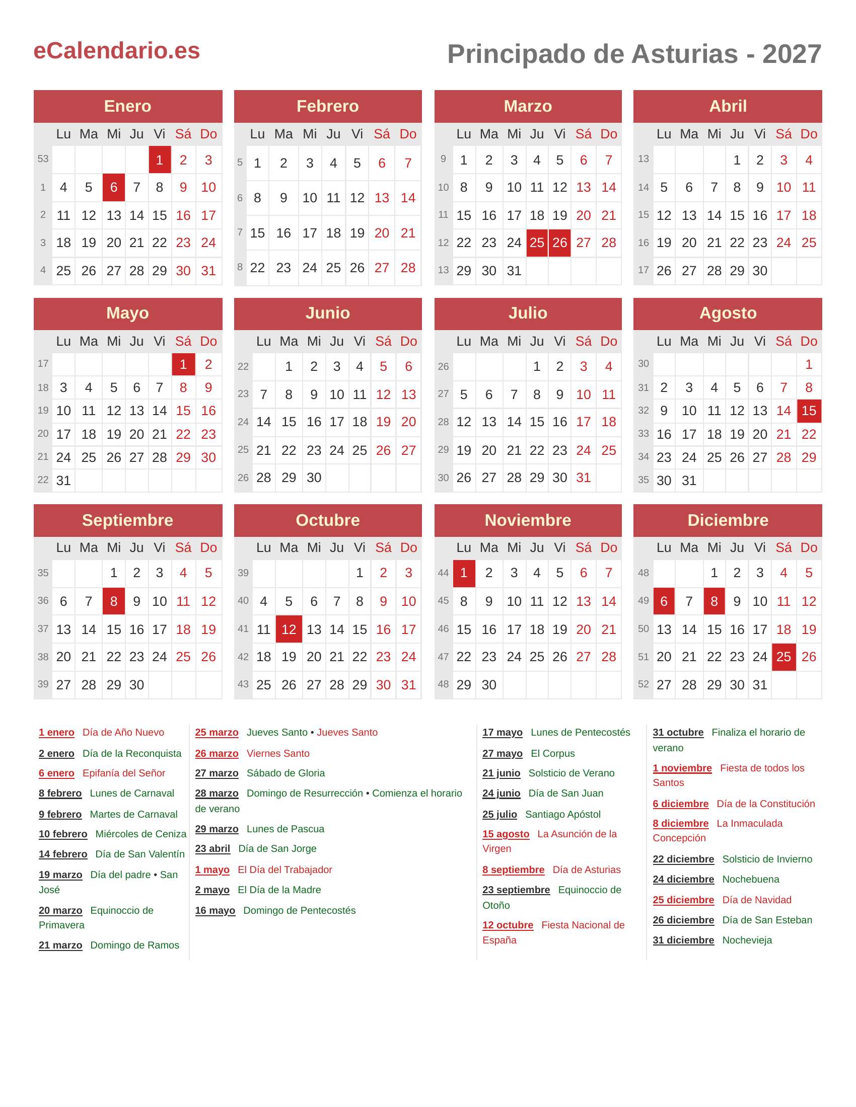 Calendario 2027 - Principado de Asturias