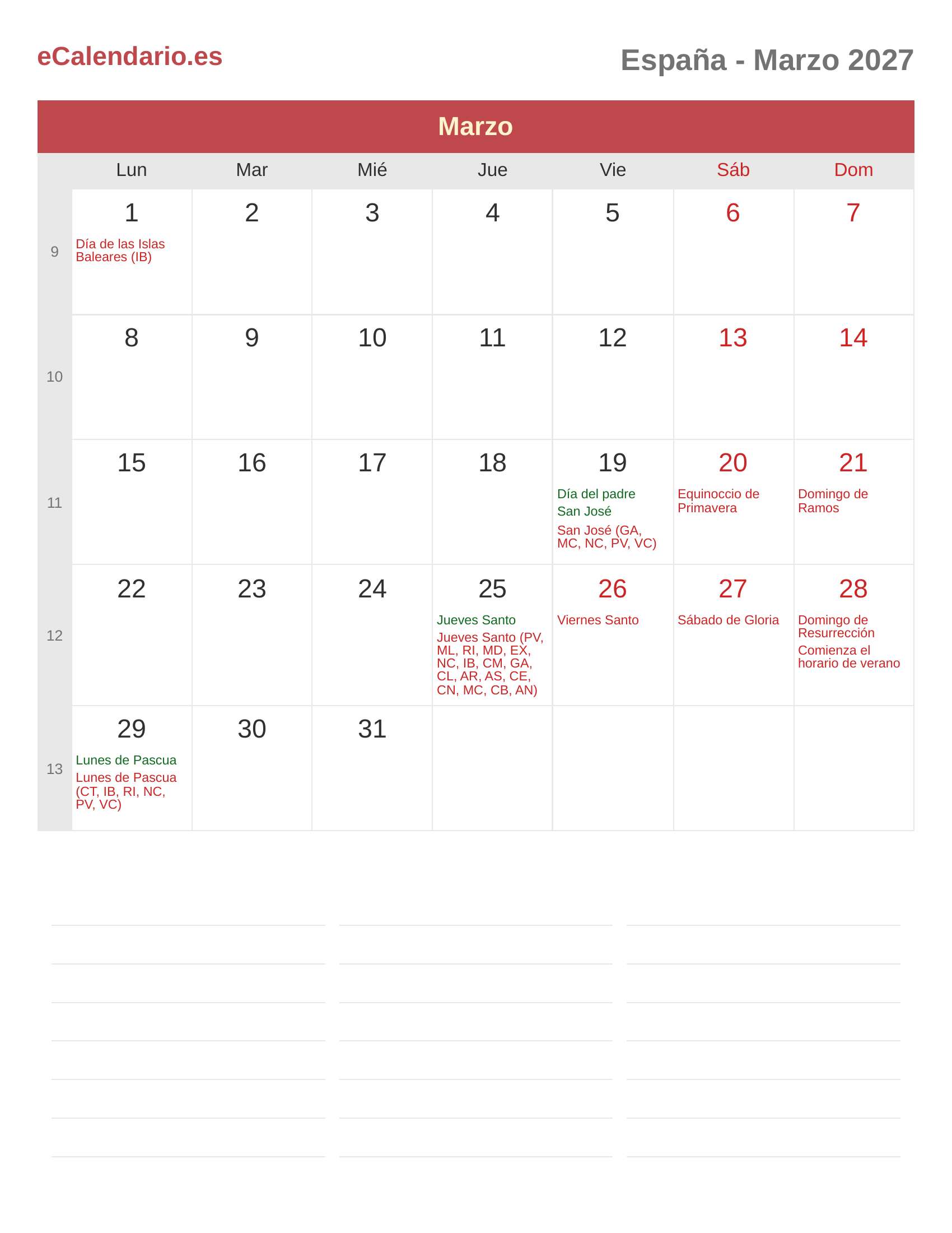 Calendario Marzo 2027 - España