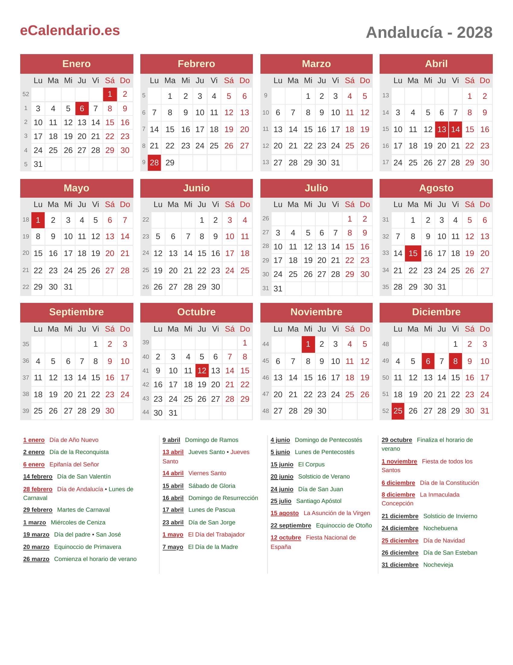 Calendario 2028 - Andalucía