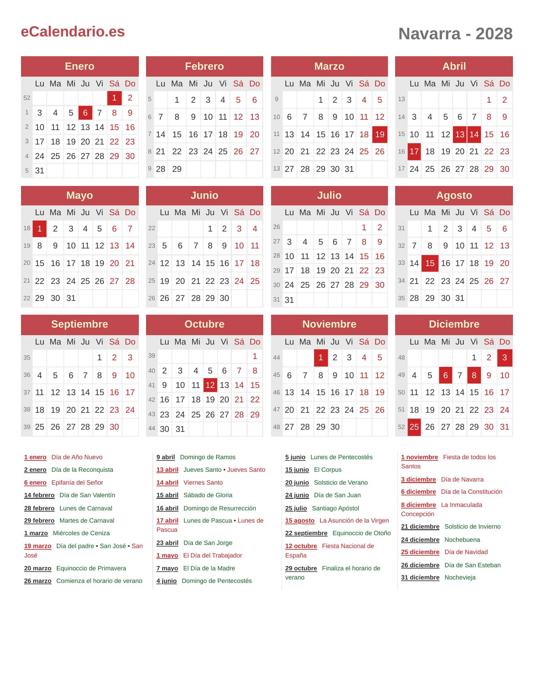 Calendario 2028 - Navarra