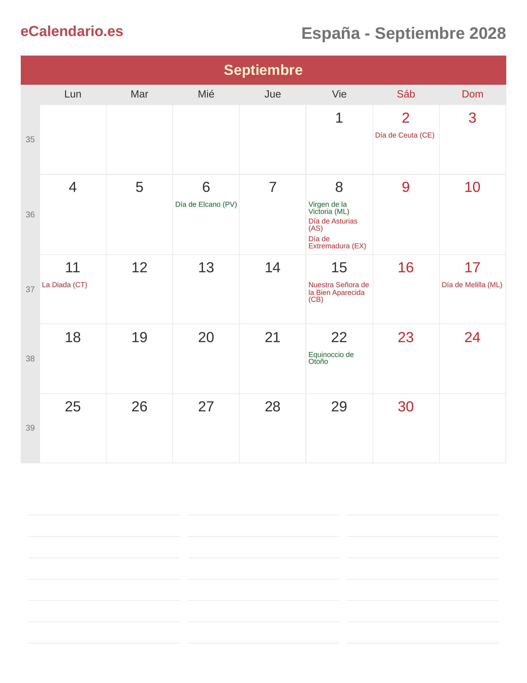 Calendario Septiembre 2028 - España