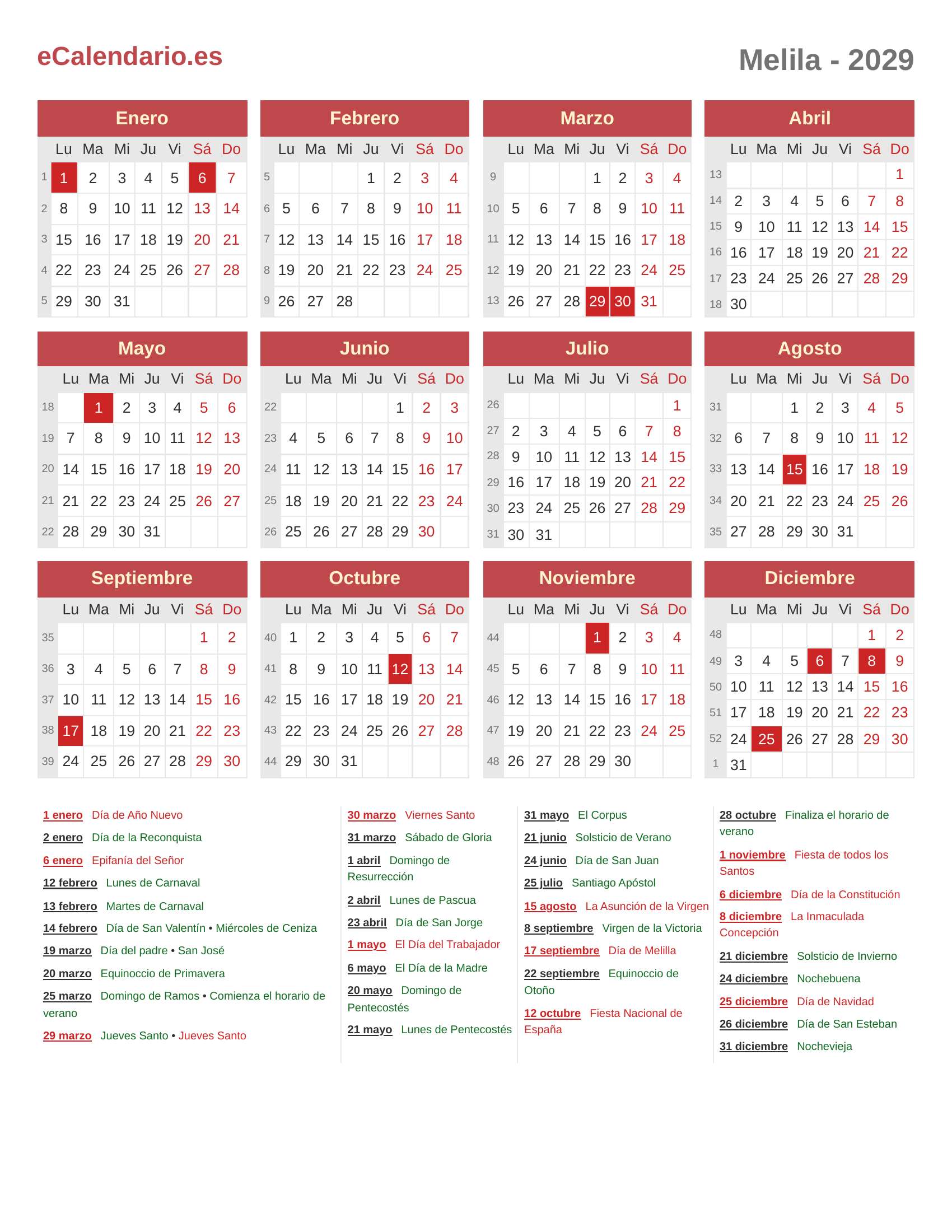 Calendario 2029 - Melila