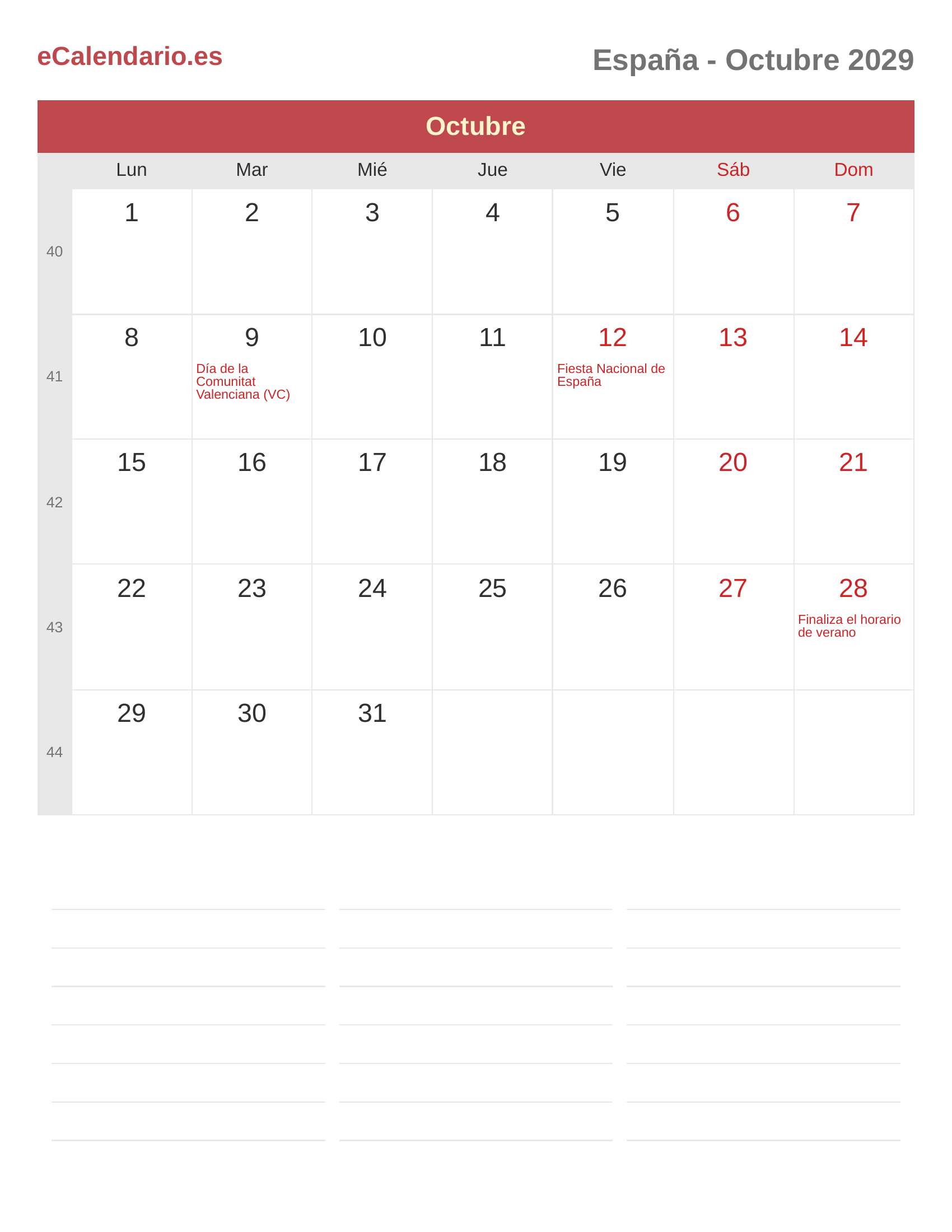 Calendario Octubre 2029 - España